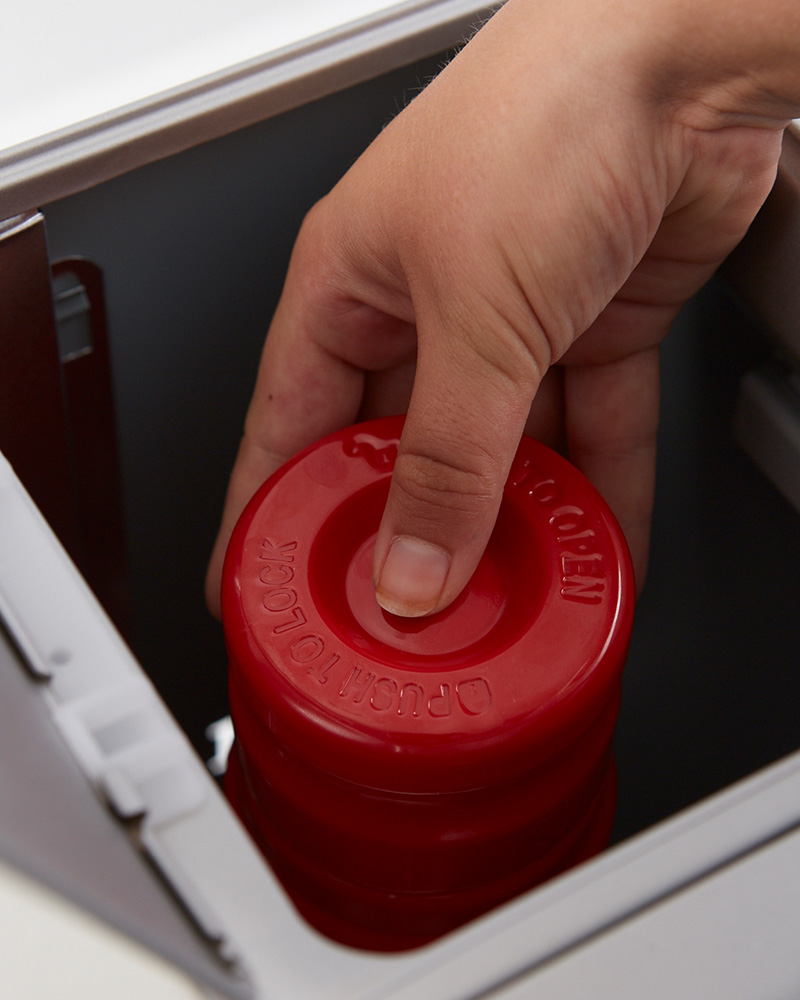 Tome un cartucho Toyotube sellado y retire la tapa y el sello antes de usarlo, empújelo firmemente en el adaptador y gírelo para bloquearlo en su lugar, permitiendo que la transferencia de combustible limpio al tanque del calefactor sin derrames se realice mediante este sistema porque el Toyotube solo dará combustible cuando esté conectado.