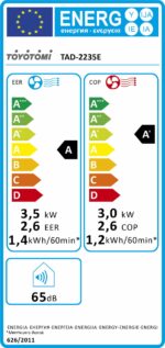 El Aire Acondicionado Portátil Toyotomi TAD-2235E tiene una capacidad de 3500 vatios y se puede utilizar para enfriar y calentar espacios de entre 85 y 120 m³. Este Aire Acondicionado Portátil tiene la etiqueta energética A para refrigeración y A+ para calefacción.